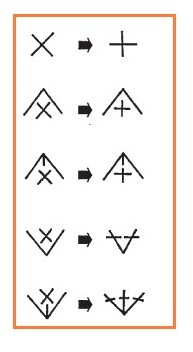 菱形针与条纹针的针法名称虽然不同,却是用相同的符号图表示的。织片正面像菱形一样呈凹凸状的是菱形针,每行有条纹针凸出的是条纹针。无论哪种编织方法都是挑取前1行针圈顶部的半个针圈,不过一个是挑前侧,一个是挑后侧。