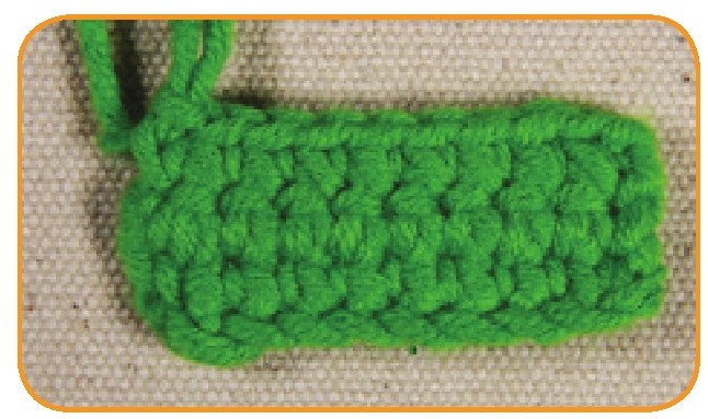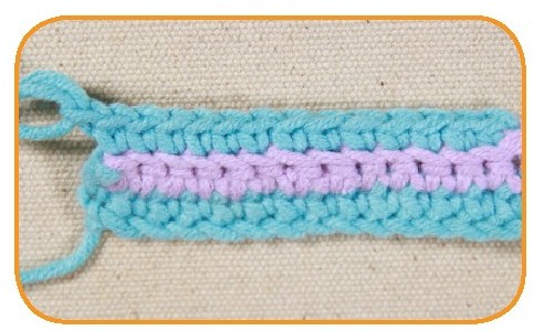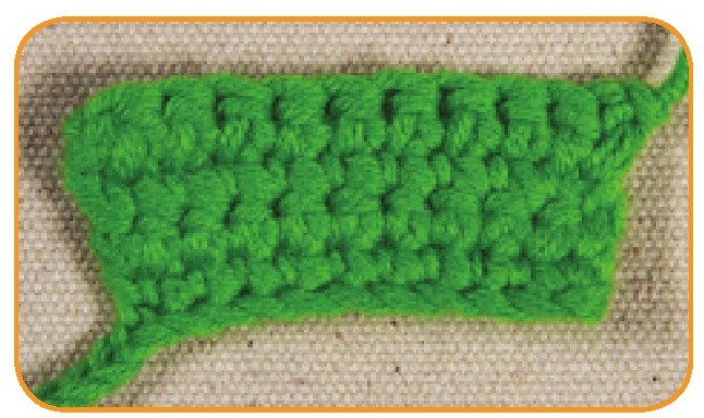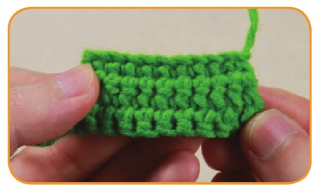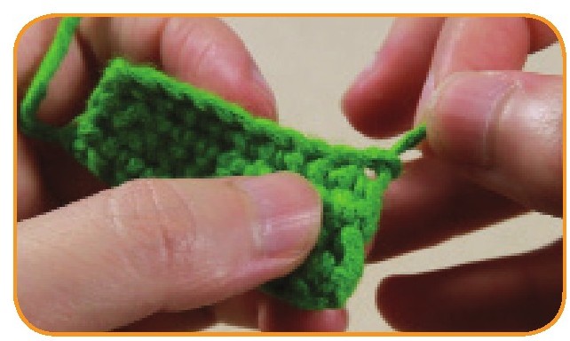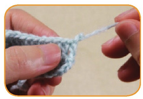 10. 左端最后1针也是挑前行短针针头的2线编织。织片的翻面方法和步骤7相同。