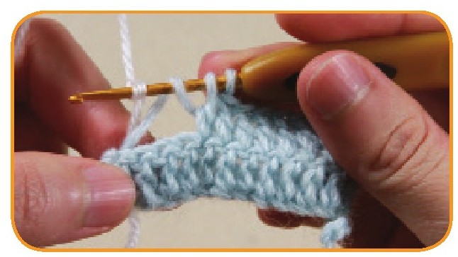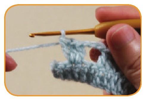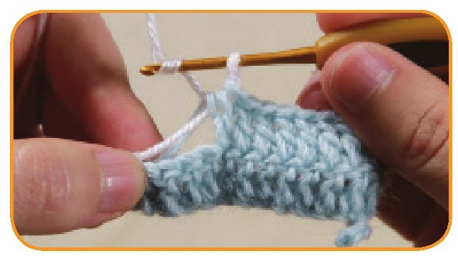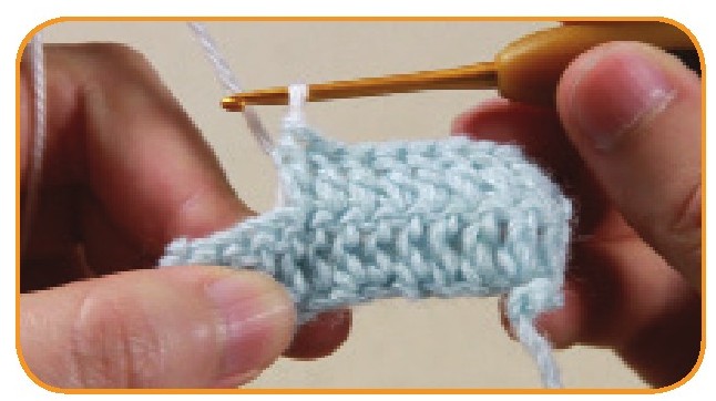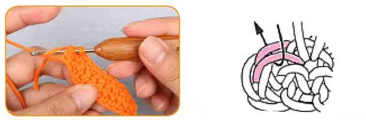 整段挑起前1行的线圈钩织。不管是什么针法,不管有几针,都是同样的方法。