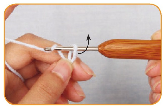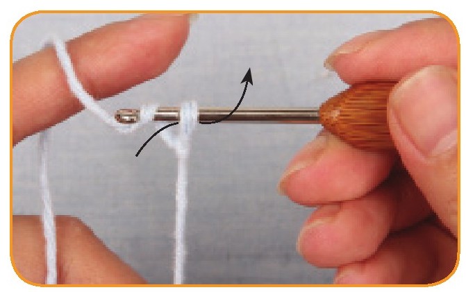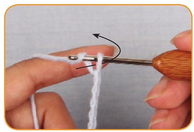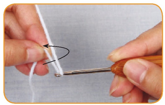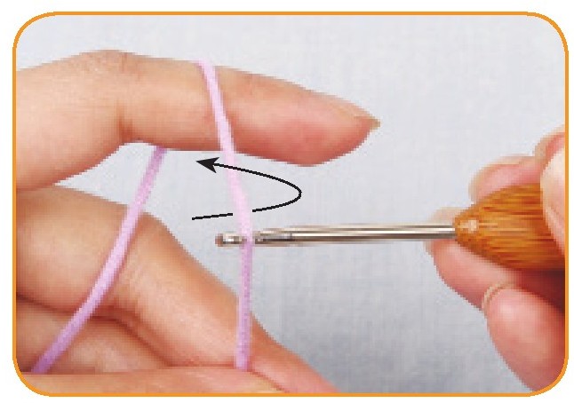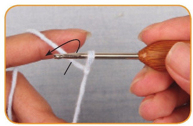 2. 钩针向下钩住线,按箭头所示转一圈。