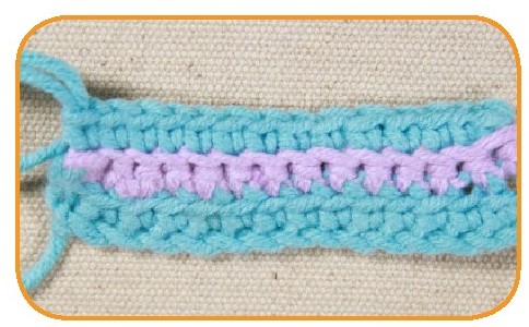 在钩织过程中,我们经常会遇到钩织线不够的情况,通常我们可以将新线系在原钩织线上,继续钩织,不过这种方法会有明显的线结,影响织片美观。因此,我们介绍一种边钩边加线的方法,如果钩织线中遇到有打结的线头的情况,也可以将线头解开或剪开之后,采取这种方法进行处理。(这里为了让大家看得更清楚,我们用其他颜色的线表示)
