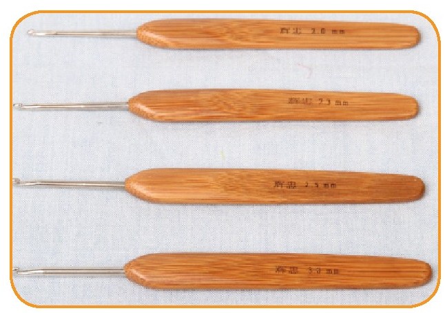 钩针的制作材料有金属、塑料和竹制等。钩针种类各异,有一端带钩子的“单头钩针”,有两端带不同号数钩子的“双头钩针”,还有带握柄的笔形钩针等。带握柄的钩针拿起来很顺手,编织过程中不容易感到疲劳,非常适合初学者使用。