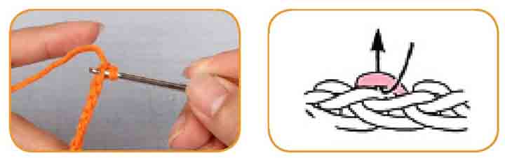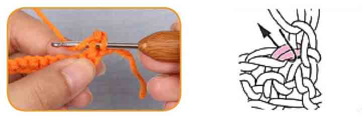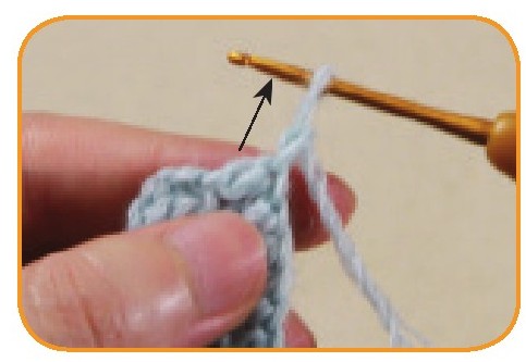 2. 在锁针的里山挑针。从起针第1针的里山穿入钩针,挂线后引出线。
