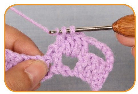 5. 连同立起的针共钩5针锁针。由前行的锁针做束的挑针。