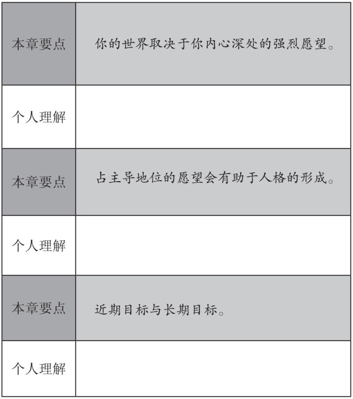 占主导地位的愿望会帮助我们塑造自己的人格。简单来说,一个人最强烈的愿望是什么,他就能成就什么。上面这句话适用于任何人。皮尔黎(著名探险家)曾说,整整二十四年,无论是梦中还是清醒时分,他人生的唯一梦想和目标就是到达北极。爱迪生和白炽灯、斯蒂文森和火车、富尔顿和蒸汽轮船、拿破仑和欧洲霸权、圣女贞德和法国的解放、圣徒保罗和传教事业等等,所有这一切都是对那种强烈的、控制一切的愿望所作出的回应。这些祷告可能是真,也可能是假,但是你所求的是什么,你就会得到什么。这一点警示我们:要保持自己愿望的纯洁性,个人的愿望不要过于自私,要使个人的愿望与公众的利益相一致。