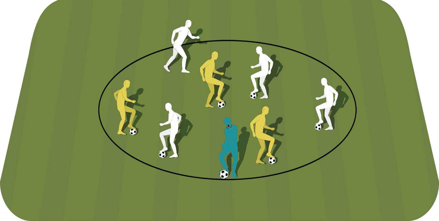 组织形式 利用足球场中圈或用标志物设定圆形,学生在圈内进行练习,根据学生人数和场地大小可设定1~2个练习区域。
