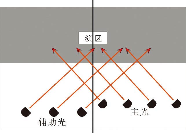 主辅光布光法是指在综艺节目中将演区沿中线分为左右两个部分,然后分别将成组的主光和成组的辅助光置于中线两侧的布光方法。这种布光方法有两个要求,一是灯位等距离排列,呈线状且平行于演区边沿;二是辅助光的灯具数量比主光少且与演区的距离要大于主光与演区的距离(见图1-57)。
