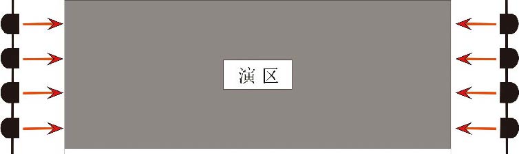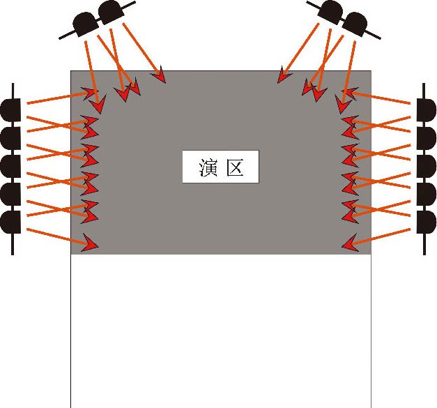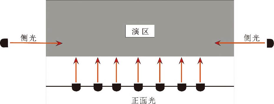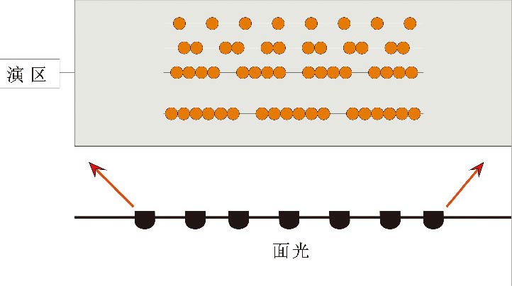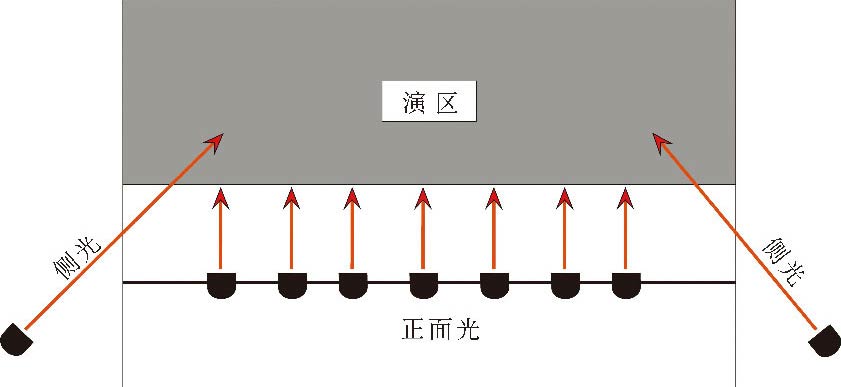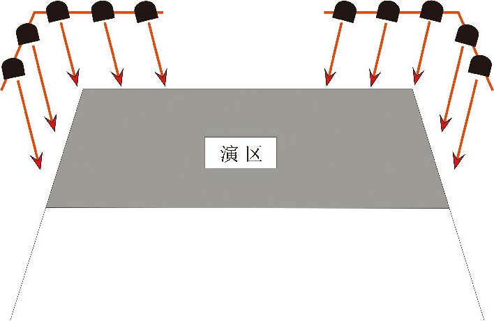 这里的正面光实为主光。布置正面光时,需做到灯位等距离排列、呈线状且平行于演区,见图1-55。侧光分别布置于演区两侧。相声、小品类综艺节目往往采用如图1-56所示的布光方式,即侧光与正面光呈90°并布置于演区两侧。