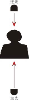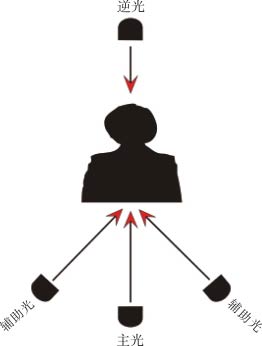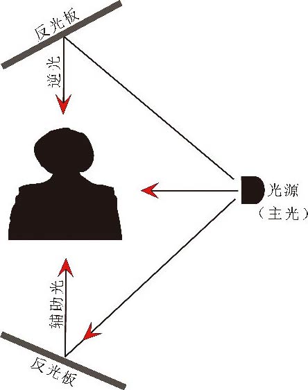 第三种方式:如图1-52所示,将光源置于主持人后侧,两块反光板均位于主持人前面,调整好反光板位置,让其中一侧的反光形成主光,另一侧的反光形成辅助光,而光源形成的光成为逆光。