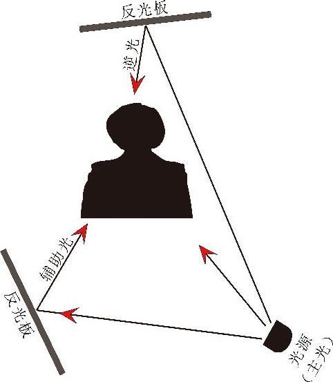 第一种方式:如图1-50所示,将光源置于主持人左前侧(右前侧亦可),于右前侧和后侧放置反光板并调整反光板角度,让光源生成的光成为主光,右前侧反光成为辅助光,后侧反光成为逆光。