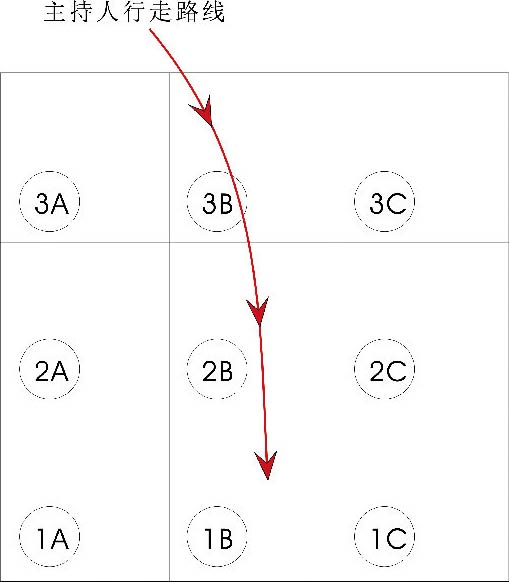 分区布光法实为一种动态布光法。布光时将整个布光区域分为纵深度上的前、中、后三个区及横向上的左、中、右三个区。如图1-53所示,当主持人从后台进入演播室时,可根据其行走路线设置灯光的亮与暗。如主持人进入3B区域时2B区域灯光亮起形成主光,3A、3C区域灯光亮起形成辅助光,其他区域灯光保持熄灭状态;当主持人进入2B区域时,2B、3A及3C区域灯光熄灭,1B区域灯光亮起形成主光,2A、2C区域灯光亮起形成辅助光,3B区域灯光亮起形成逆光。