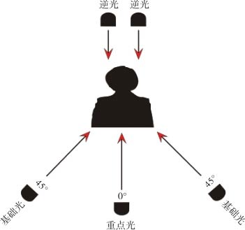造型式布光法即局部式布光法。这是一种非常简单明了的布光方法(见图1-49),国内的演播室中尚不多见。它的主光往往是两台成像灯,通常置于摄像机上方。