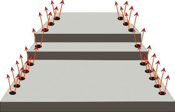 综艺节目的演区是一个三维立体空间,布光时需将每个面都纳入考虑范围,包括台面。台面布光包括以下两种情况:一是照亮台面,增加真实性;二是通过台面布光完成画面平面分割或空间占领。第一种情况的布光如图1-62所示,将灯具排列成线,使之略高于演区平面且平行于演区边沿,布置于演区两侧。后侧两只角的位置也需按一定角度设置两组成线状排列的灯具。第二种情况如图1-63所示,将灯光的投射方向垂直向上且排列成线状,布置于台阶地面两侧,这种方法可完成演区的平面分割。若让每一盏灯形成清晰可见的光柱,光柱就可以占领画面立体空间,加强地面与其他空间部位的联系。