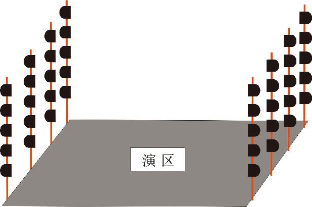侧光布光法包括以下三种布光方式:一是将灯具等距离、成线状排列,分别布置于演区两侧,线状排列的灯具与演区边沿平行(见图1-59);二是将灯具等距离呈线状排列且与演区成90°直角竖立于演区边沿(见图1-60);三是将灯具排列成线,并在线的中点位置将其折为90°直角,分别置于演区后部左右两个直角上方(见图1-61)。