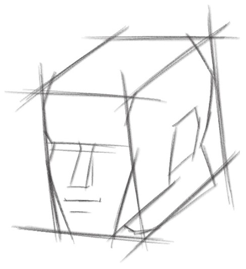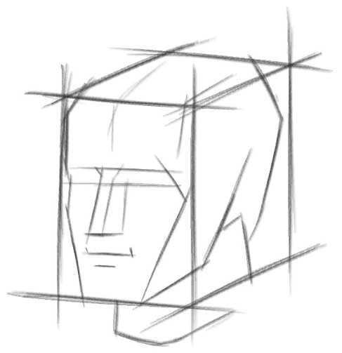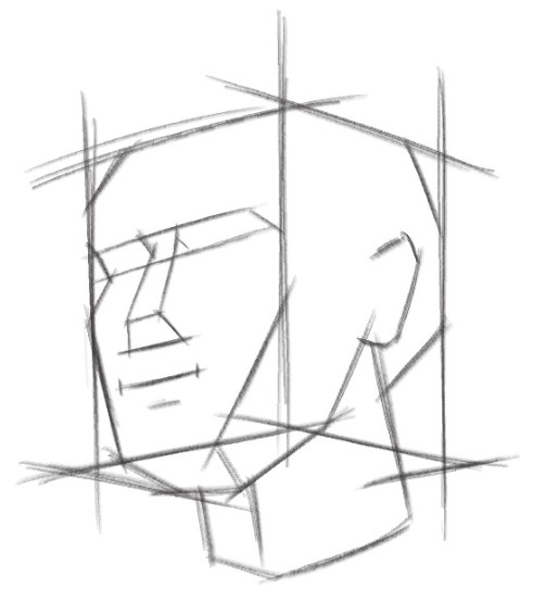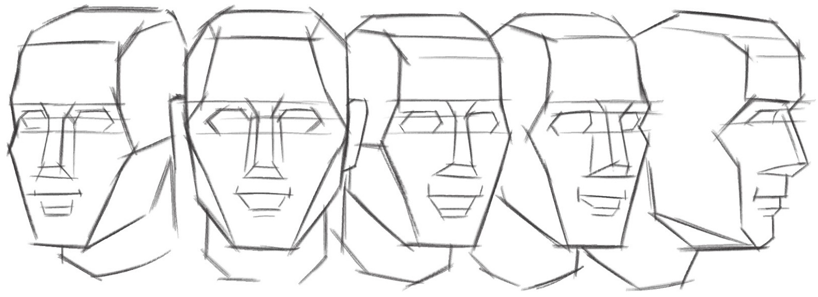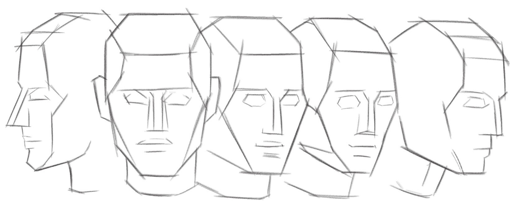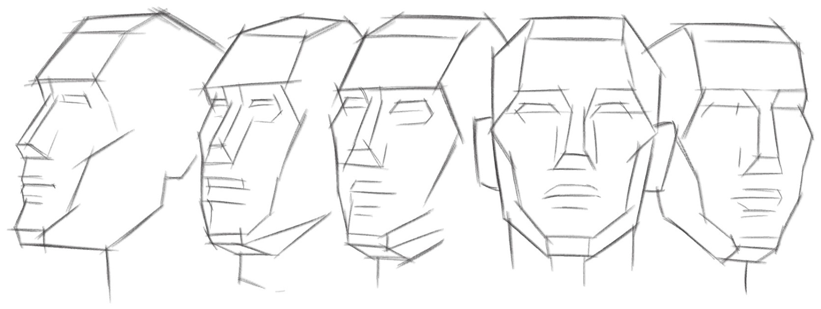 平视:透视现象较弱,比例匀称;从上图各个角度可以发现头部结构的变化是有规律的。