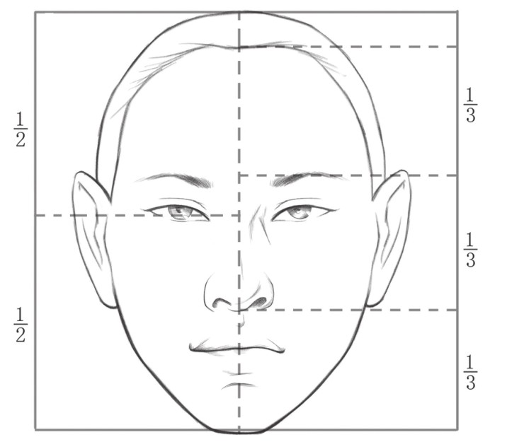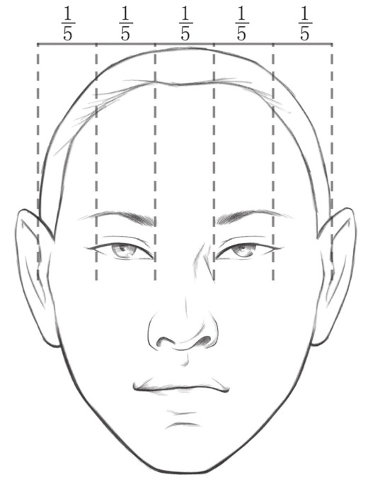 “三庭五眼”是人的脸长和脸宽的一般标准比例;“三庭”即从额头发际线到下颚为脸的长度,将其分为三等份:由发际线到眉毛,眉毛到鼻尖,鼻尖到下颚为三庭;“五眼”即以一只眼的长度为标准,从发际线到眼尾(外眼角)为一只眼,从外眼角到内眼角为二眼,两个内眼角的距离为三眼,从内眼角到外眼角的长度为四眼,从外眼角再到发际线为五眼