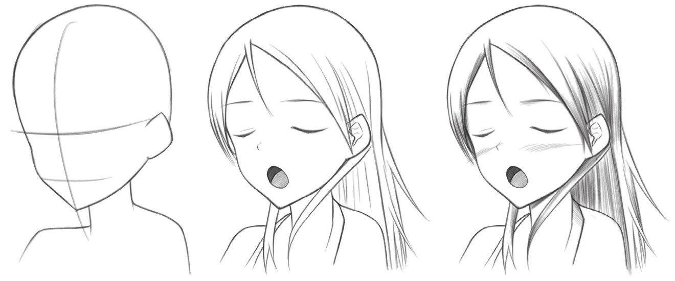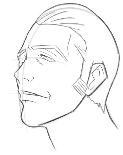 2 刻画出人物发型和五官样式,注意五官透视变化要正确。