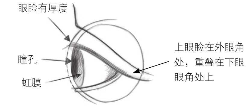闭上眼睛时的表现:中间粗,两端细,女生还可以在两端添加一些睫毛,让人物看起来更加妩媚。注意这个角度,两只眼睛的长度是不一样的。