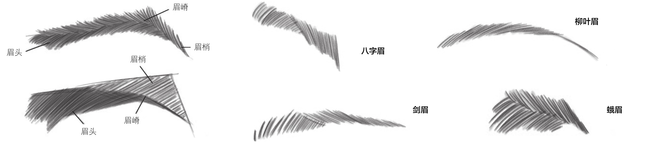 眉毛位于眼睛上方,有很多眉形,如柳叶眉、八字眉、蛾眉、剑眉等。
