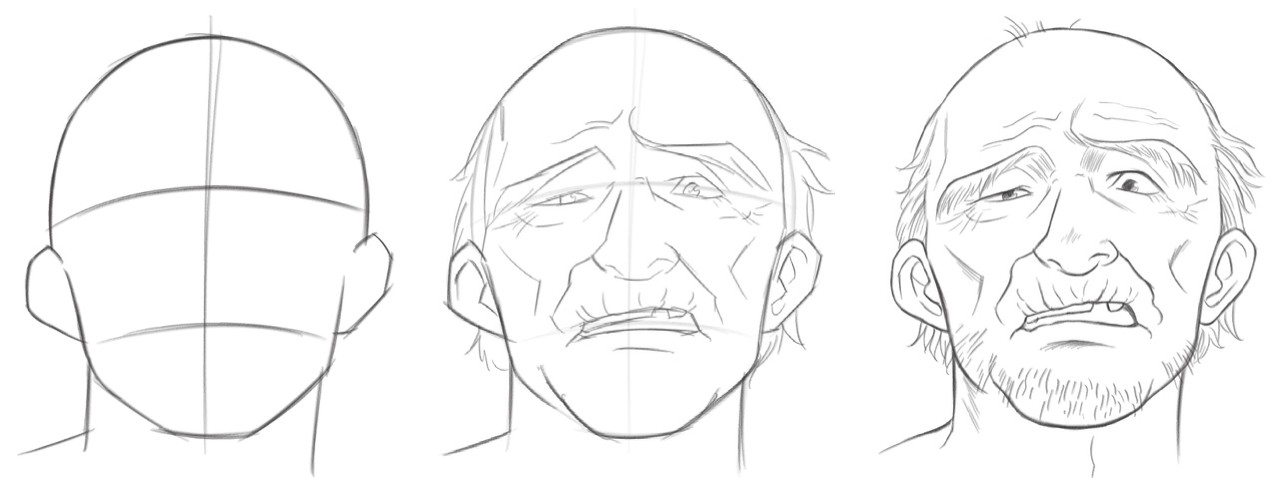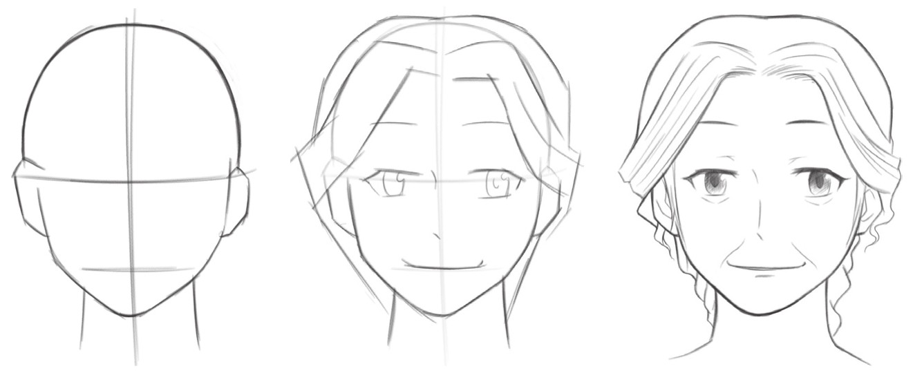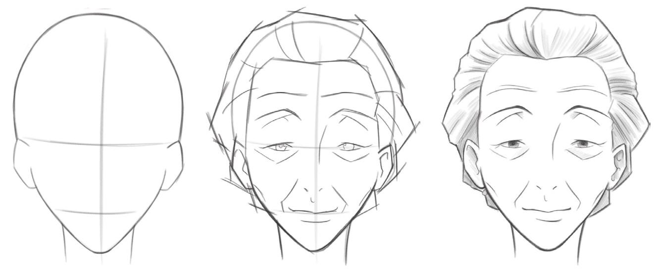 随着年龄的增长,人物的样子会发生不同的变化,如幼儿时脸是圆嘟嘟的,眼睛是大而圆的;成熟后脸型变得瘦长,眼睛变得细长等;老了以后,皮肤松弛下垂,脸上的皱纹很多等。