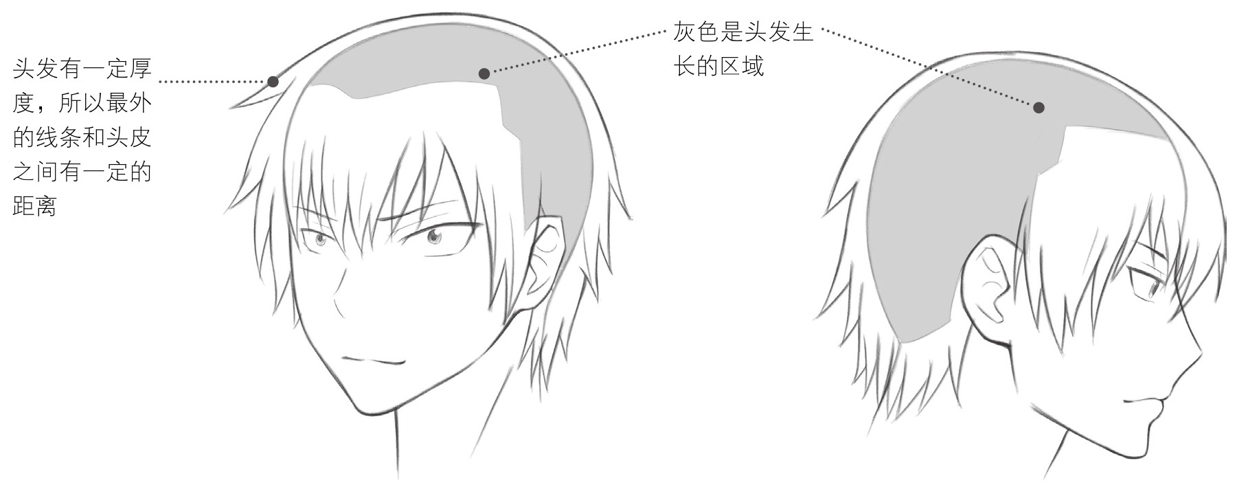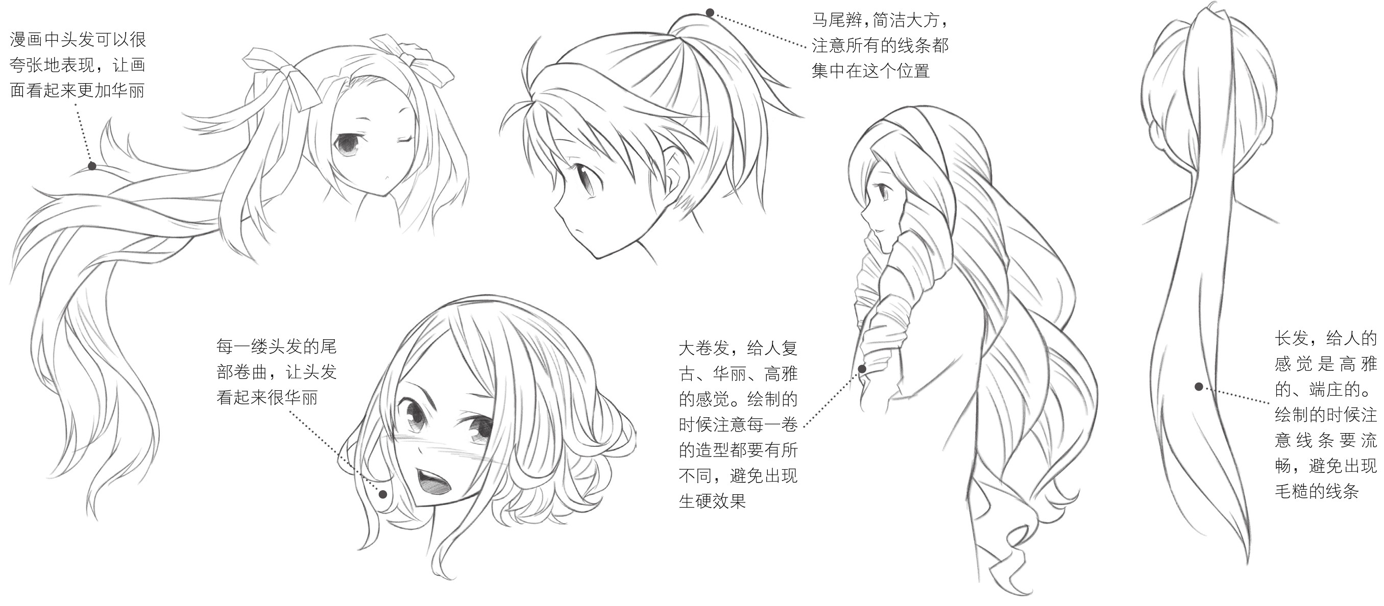 绘制头发时要注意头发的生长区域,如发际线不能过高或过低等;要注意头发的走向,才能让头发看起来是自然的;要注意每一缕头发的表现都不是多余的;绘制的线条要流畅,这样才能让头发看起来是飘逸的。
