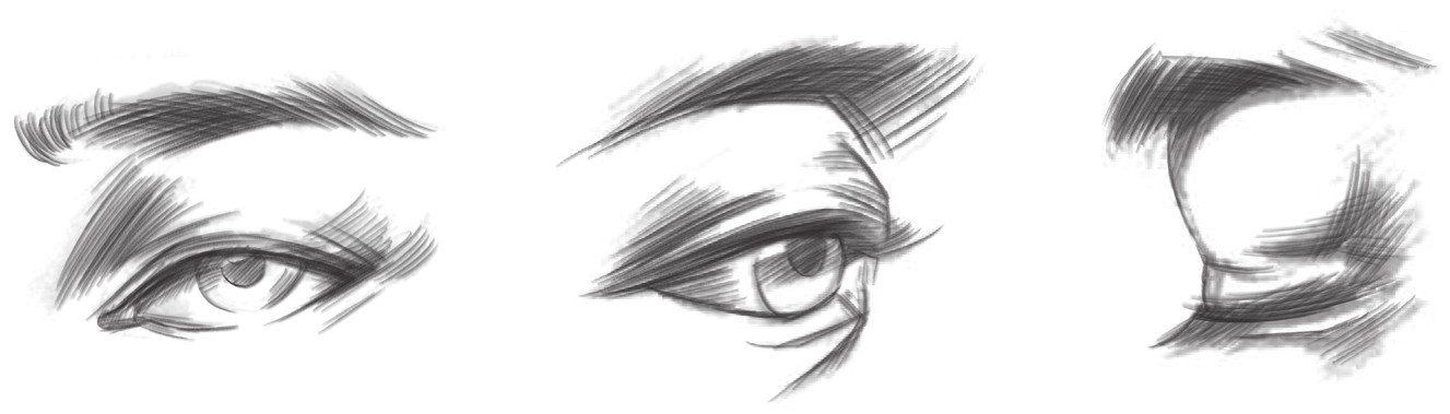 生气时眼睛的表现:眉毛倒竖,眉毛和眼睛间的距离很近,眼神犀利。注意这个角度,两只眼睛的透视变化要正确。
