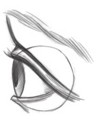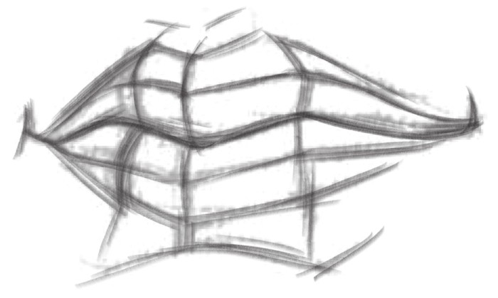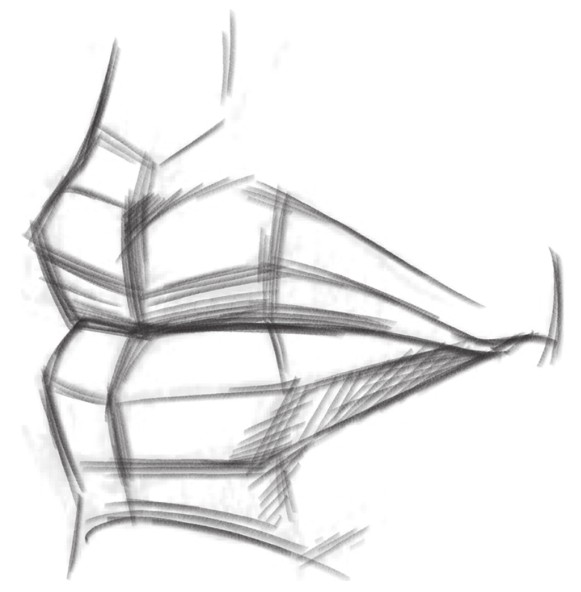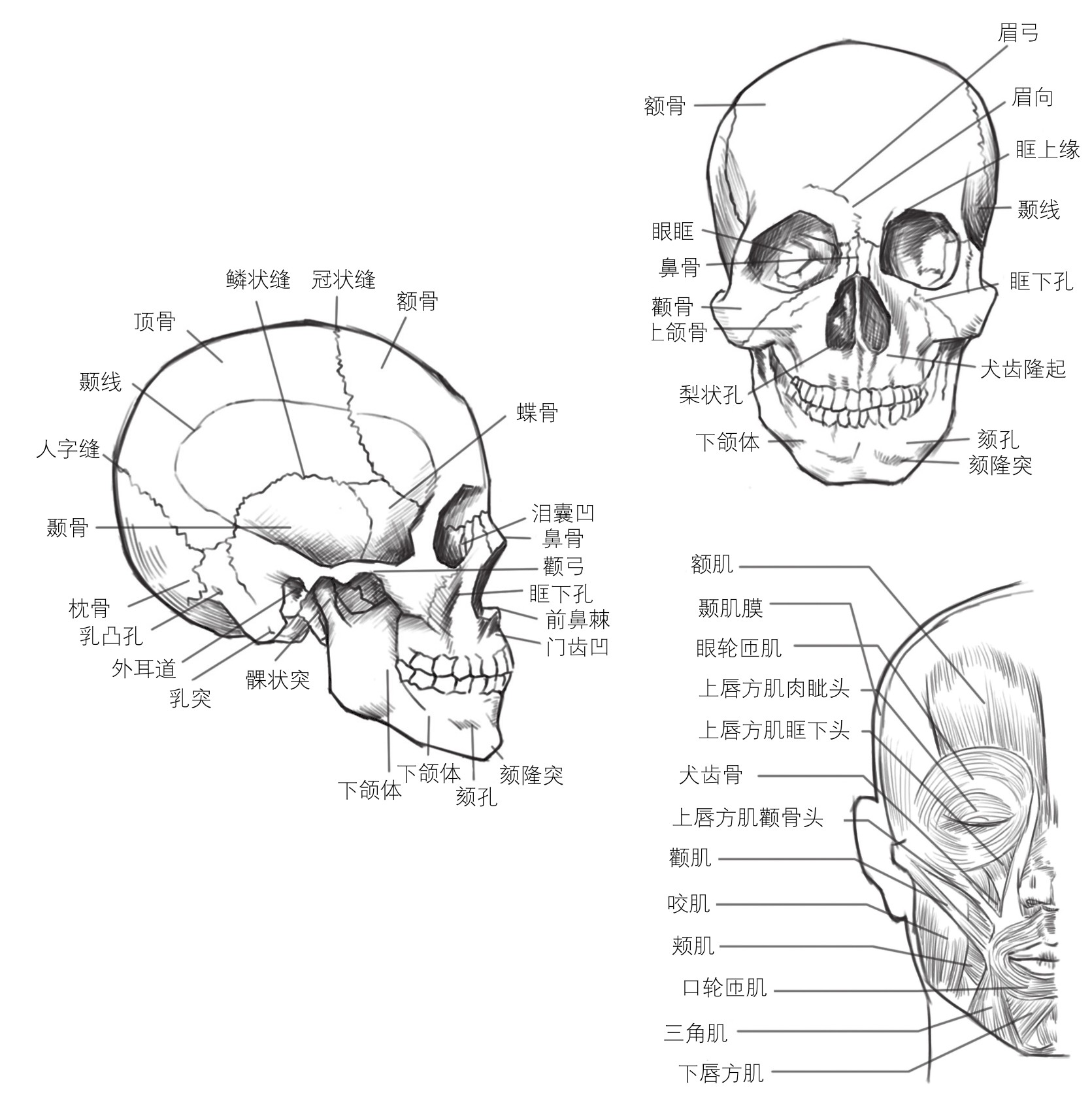 头骨之上覆盖的是肌肉层,包括额肌、眼轮匝肌、上唇方肌、颧肌、咬肌、口轮匝肌、三角肌、下唇方肌和颊肌等。肌肉是表现对象表情十分重要的因素,因为不同的人物,其脸部肌肉的厚度也有所不同,如口轮匝肌、上方唇肌。如果初学者没有对头骨结构和肌肉进行细心地观察和分析,而只是盲目的绘画,是不会有多大进步的。所以学习和研究头部结构是必要的