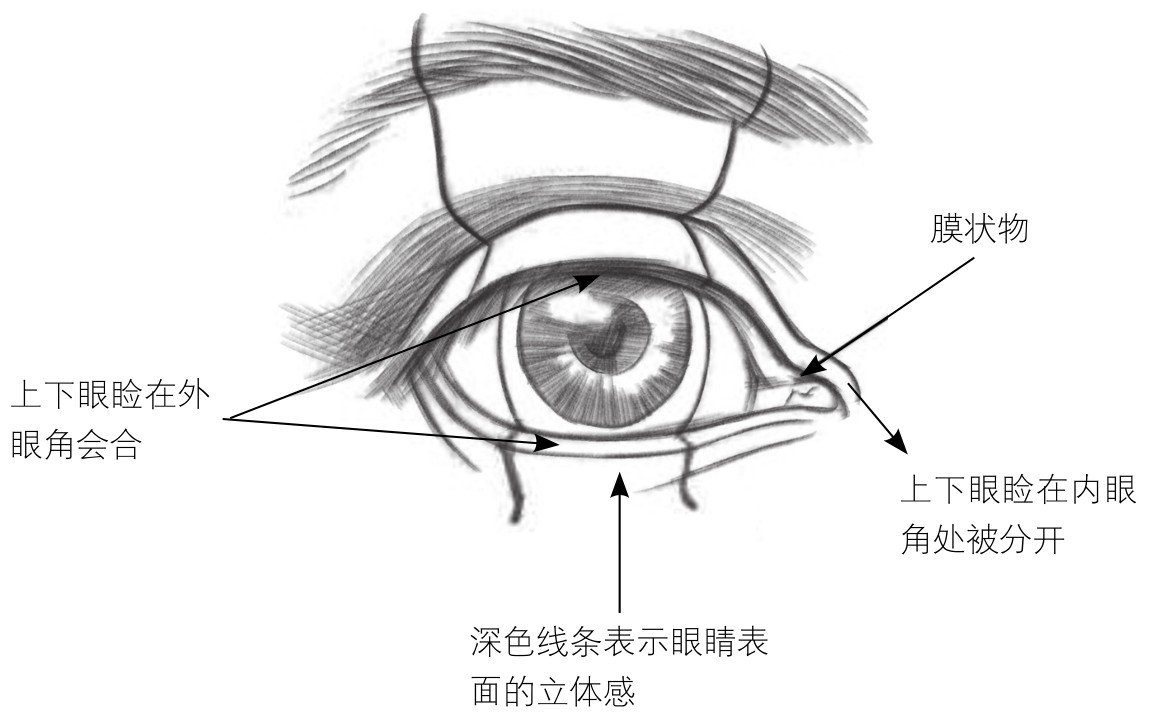 眼睛是人物传神的关键部位,是深入刻画人物时所占比重最大的部分。眼睛由眼眶、眼球、眼皮等组成,可以理解为含在眉弓下眼眶内的一个球体,由瞳孔、角膜、眼角组成,有一定厚度的眼睑包裹在其外。注意绘制眼睛的时候,还要注意眼球是半圆形,眼珠是透明的,不能绘制成死黑,而是越接近亮部越黑,暗部反光越透明。