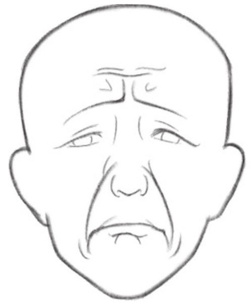 发怒时,眉毛倒竖,眉间形成川字,嘴角下弯