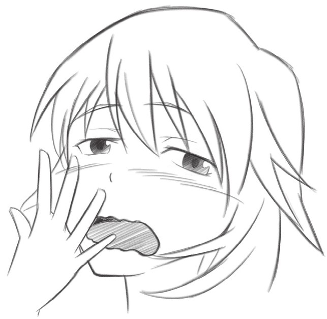 用手掩住嘴巴,嘴巴张开,用抖动线表示人物没有精神,眼睛半眯着,是打哈欠的表情,表现人物无精打采的样子