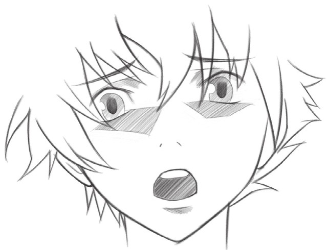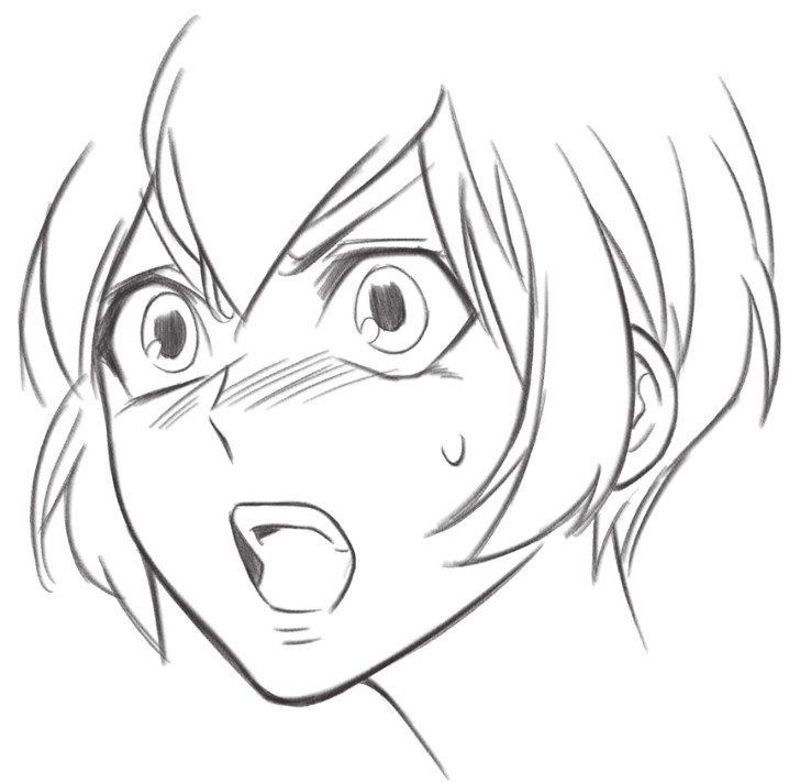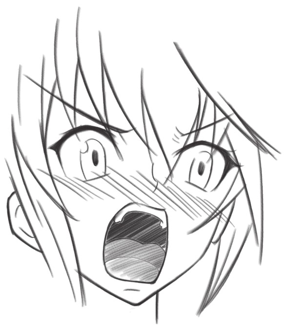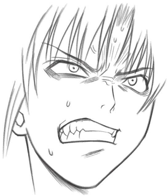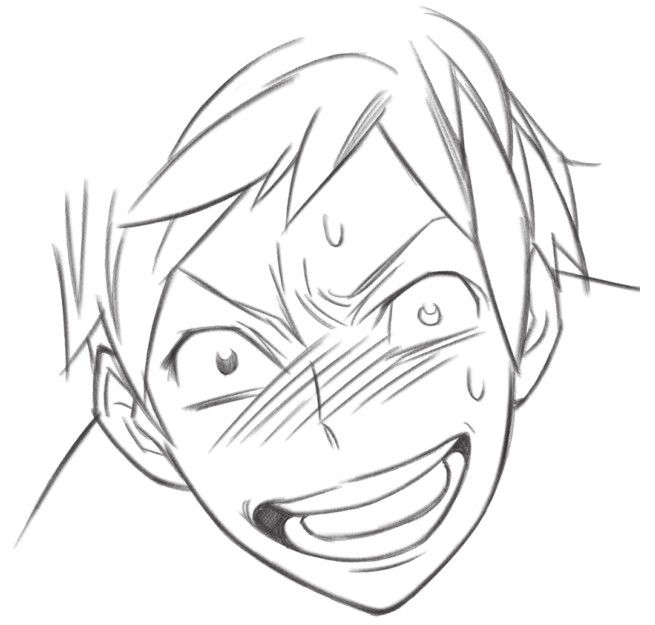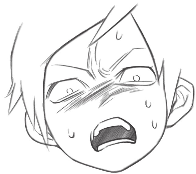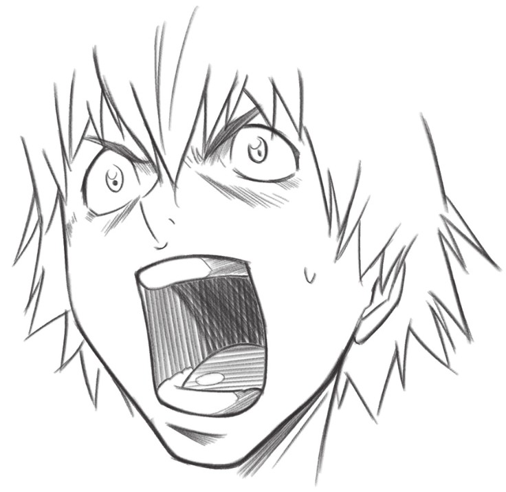 缩小的瞳孔、张大的嘴巴,是恐吓别人的表情,脸颊的斜线和汗水表示人物现在情绪很激动