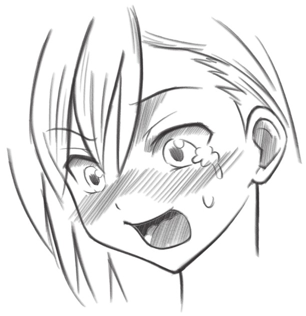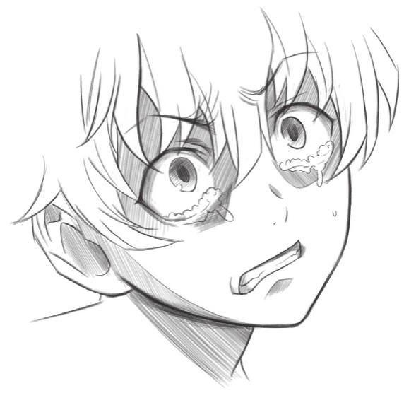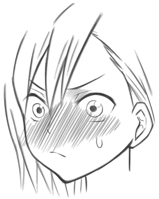 通过连接的斜线表示人物脸红,还有眼泪,传达出人物紧张、情绪激动到流泪的表情
