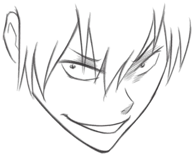 缩小的瞳孔让眼神看起来很邪恶,一边的嘴角上扬,让笑容更加阴险