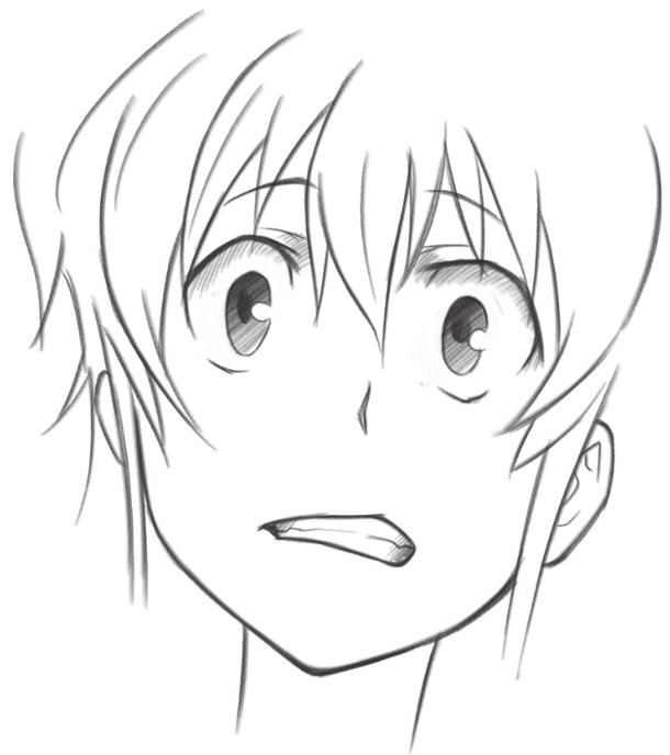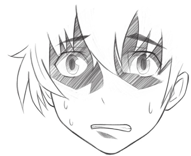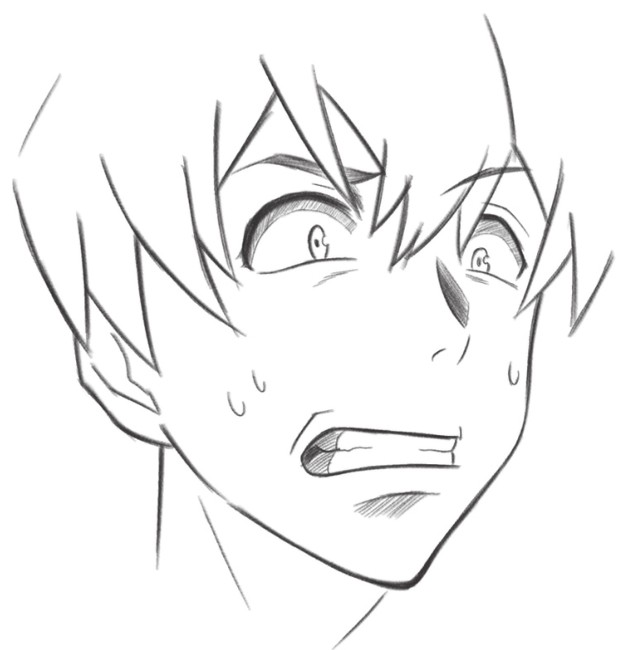 眉毛倒竖、缩小的瞳孔、张大的嘴巴和汗水表现人物紧张害怕的感觉