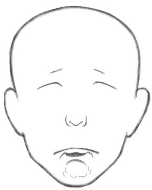 无辜,眼睛眯起,嘴巴嘟起,嘴角向下弯