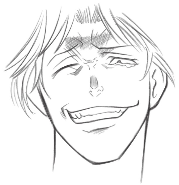 眉头紧锁,眉间形成川字,缩小的瞳孔和咬着牙笑的嘴巴,给人阴险邪恶的感觉