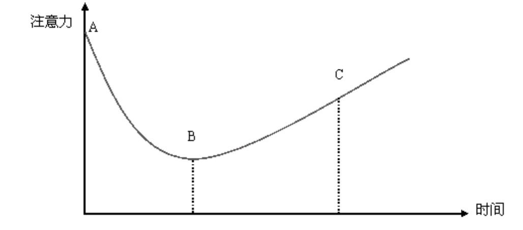 以一堂2个小时的成人课程为例。学生开始上课时处于兴奋、期待中,注意力很集中,课程开始后,注意力开始下降,在30分钟左右跌入低谷,之后又缓缓回升,犹如一个“√”。