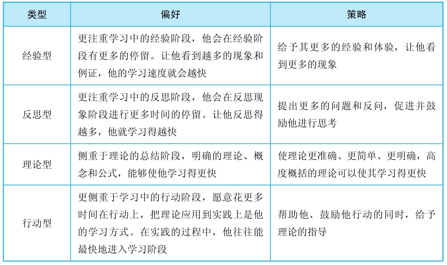 虽然每个人都会遵循学习圈理论的学习方式,但是每个人在学习中的侧重点都会不一样。这4种学习类型的产生,是由于每个人处于学习中的不同阶段,侧重点不同。