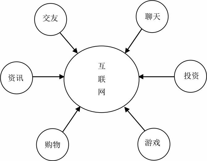 互联网是指将两台计算机或者是两台以上的计算机终端、客户端、服务端通过计算机信息技术手段互相联系起来的结果。简单来说,人们平时所说的“上网看新闻”、“QQ聊天”、“网上购物”,都需要通过互联网来实现,如图1.1所示。