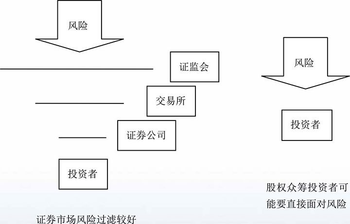 从已经出现的股权制众筹来看,众筹与股票已经有许多类似之处。但从风险的角度出发,众筹融资还需要赶很长一段路才能追上证券市场,两者的风险管理有较大差异,如图1.4所示。