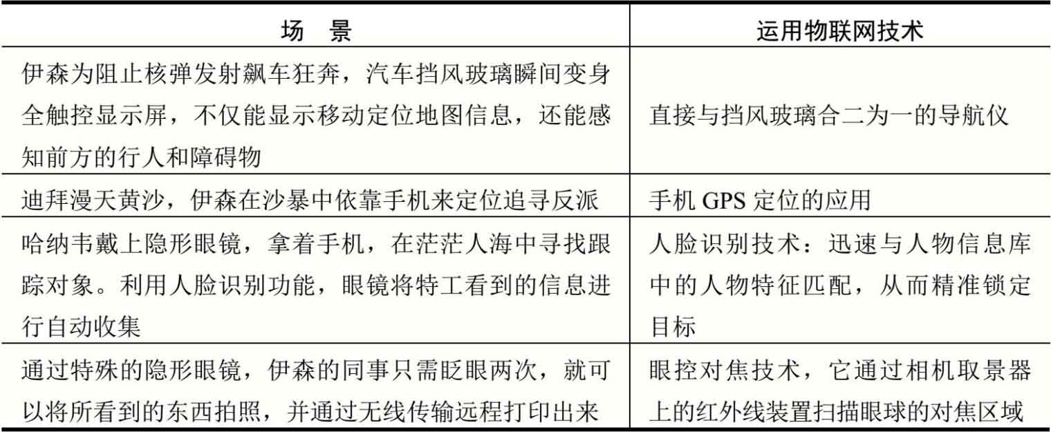 随着智能终端处理能力的增强和人脸识别技术的日趋成熟,在不久的将来,智能终端已经完全有能力准确、快速地从图像中提取人脸信息。如表1.5所示是电影《碟中碟》中的物联网技术应用。