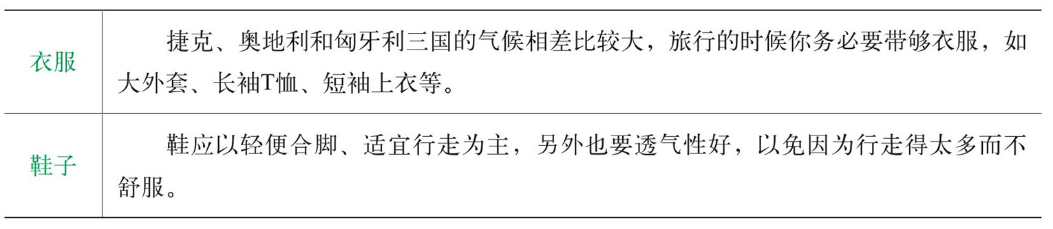 出境前还可以配备一把雨伞。另外,旅行前最好收集捷克、奥地利、匈牙利的相关旅行资料,并随身携带。