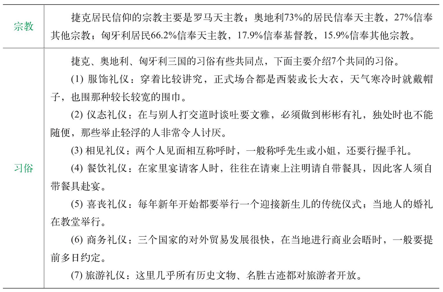 捷克、奥地利、匈牙利三地的美食各有各的特点,其中捷克人的饮食是以猪肉为主;奥地利美食是融合欧洲许多国家的特点;而匈牙利美食特色是使用简单的菜色调制出美味,以多样化的肉类及鱼类为主,然后搭配当地丰富的水果、蔬菜及调味料等。总之,来到这三个国家游玩绝对能让你尝到各种美食,一饱口福。