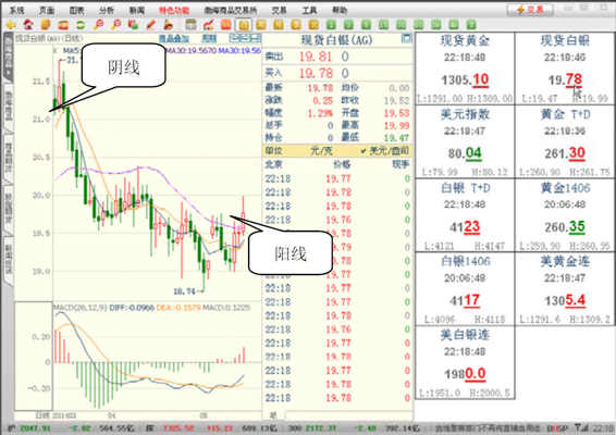 所有K线的绘制方法都相同,即取某一时段的开盘价、收盘价、最高价、最低价进行绘制。例如,周K线,只需找到周一的开盘价、周五的收盘价、一周中的最高价和最低价,就能把线绘制出来。现在电脑软件已相当普及,不需要手工绘制各种K线图,但投资者最好懂得其原理及绘制方法,这样对研究和判断贵金属走势是很有好处的。