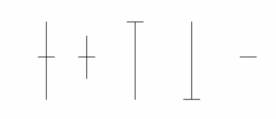 同价线是指收盘价等于开盘价,两者处于同一个价位的一种特殊形式的K线,同价线常以“十”字形和“T”字形表现出来,所以又称十字线和T字线。同价线按上下影线的长短、有无,又可分为长十字线、十字线、T字线、倒T字线和一字线,如图2.12所示。