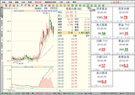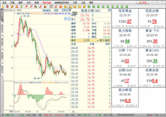 中长周期K线包括周K线、月K线、季K线等。单击工具栏中的“周”按钮,就可以看到白银现货的周K线图,如图2.14所示。
