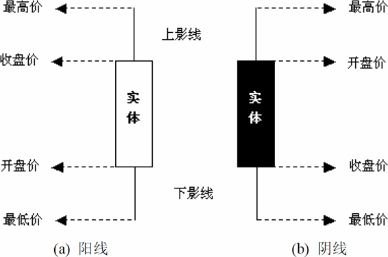 由图2.8可以看出,K线是一条柱状的线条,由实体和影线组成。在实体上方的影线称为上影线;在实体下方的影线称为下影线。实体分阳线和阴线,当收盘价高于开盘价时,实体部分一般是红色或白色,称为阳线;当收盘价低于开盘价时,实体部分一般是绿色或黑色,称为阴线,如图2.9所示。