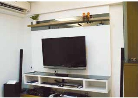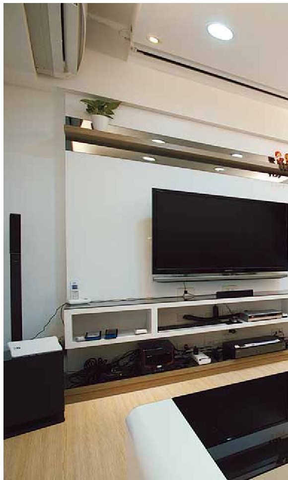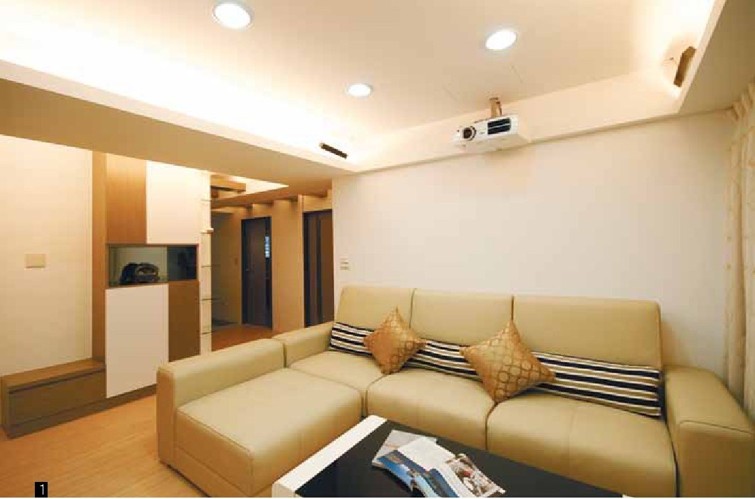 客厅电视墙由于房主的需要,因此特别预留投影机与投影布幕的位置,皆算好适当的距离。而考虑房主为已成年的姐弟,特别选用莱姆绿的沙发增加年轻气息。在空间过道的转角处,规划了一个切边的玻璃层板展示柜,让姐弟俩可以摆放自己所喜爱的小物品。