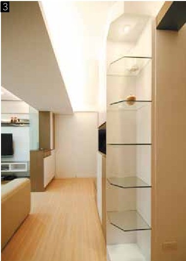 3.展示柜:位于空间过道的转角处,规划了一个切边的玻璃层板展示柜,让姐弟俩可以摆放自己所喜爱的小物品。