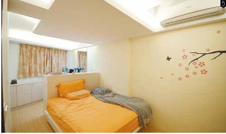 5.女生房:女生房以造型天花层板做出间接照明,透过光源来赋予空间柔和之美,并在墙面绘制桃花,祝福桃花朵朵开。